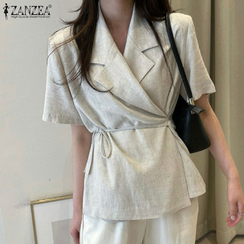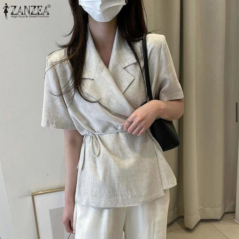 ZANZEA Korean Style Womens Short Sleeve Slims Business Office Plain Lace-up Blazer Suits