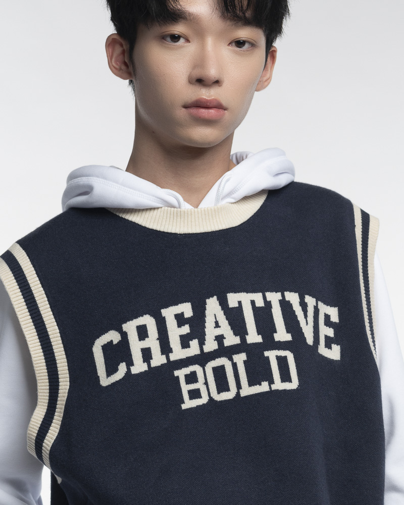 Regular Knitted Round Neck Varsity Vest With Asymmetrical Contrast Coloured Neckline and Hem. Comes with CREATIVE BOLD Slogan at the front. Made of cotton.