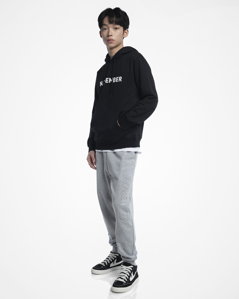 Regular Solid Coloured Long Sleeve Pullover Hoodie with Kangaroo Pockets at the front. Comes with NOVEMBER Slogan Patch at the front. Made of cotton.